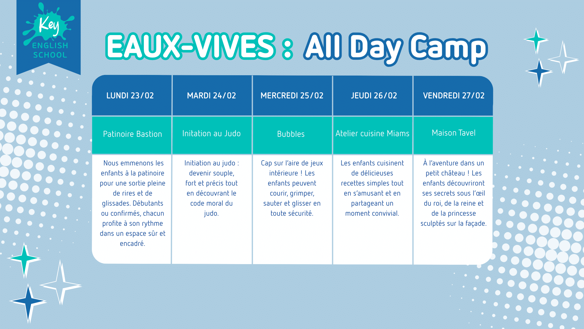 Du lundi au vendredi, de 9h à 17h, vos enfants découvriront l’anglais de manière ludique le matin, puis participeront à des activités captivantes l’après-midi.