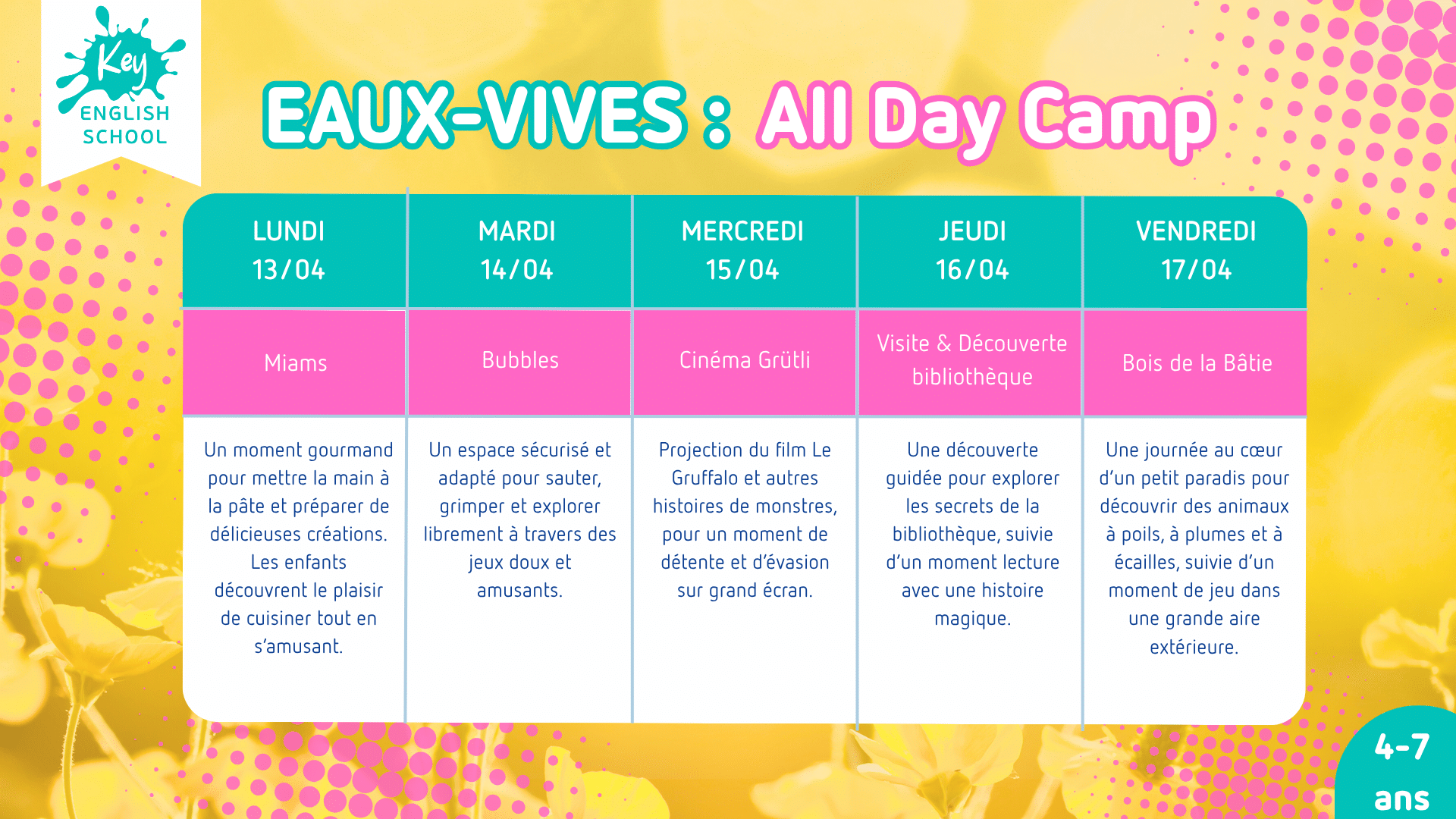 Du lundi au vendredi, de 9h à 17h, vos enfants découvriront l’anglais de manière ludique le matin, puis participeront à des activités captivantes l’après-midi.
