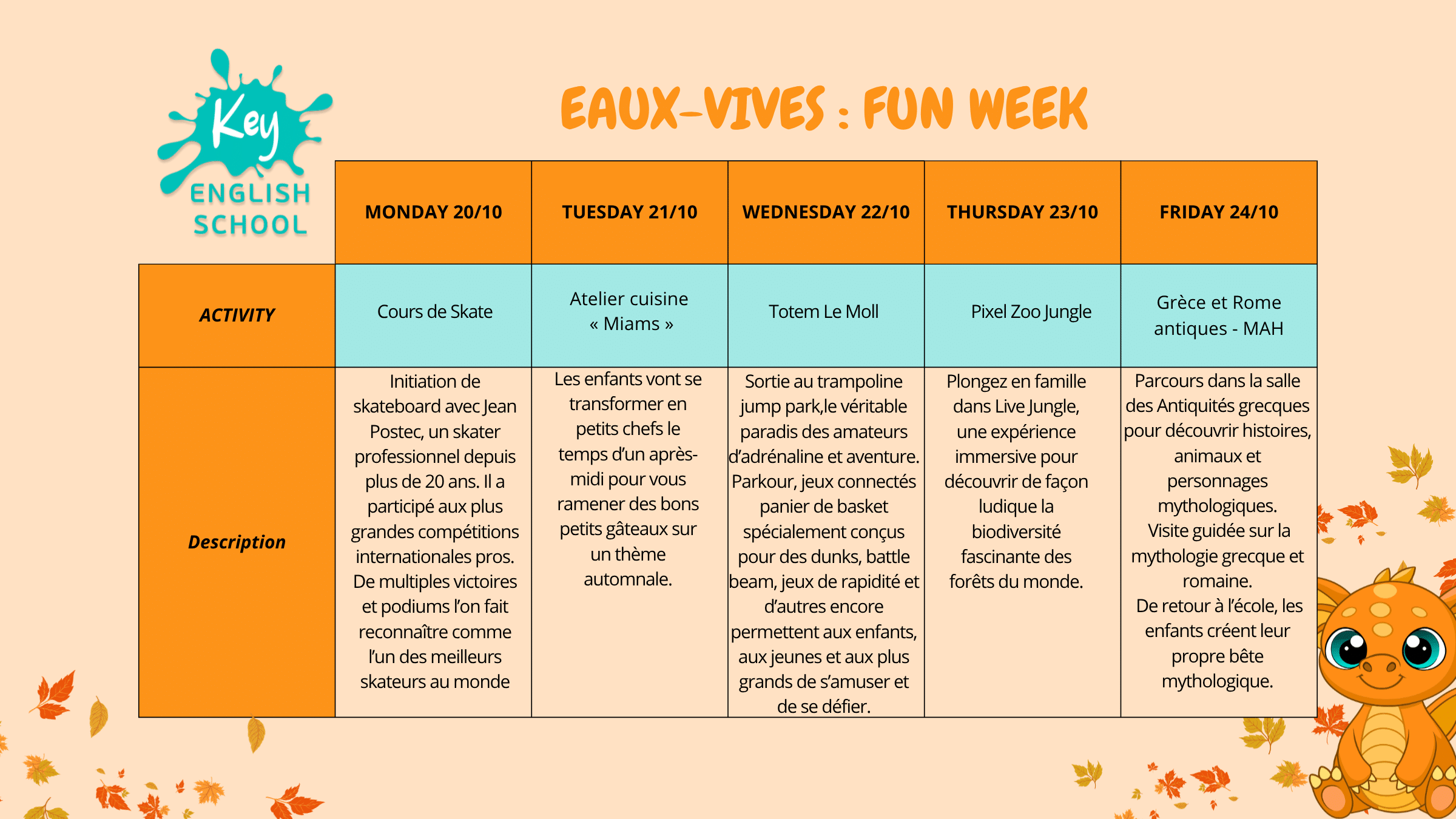 Bienvenue aux Fun Weeks des Eaux-Vives, conçues pour les enfants de 7 à 11 ans passionnés d’apprentissage et de divertissement ! Du lundi au vendredi, de 9h à 17h, vos enfants profiteront d’une immersion totale dans l’anglais le matin, suivi d’activités excitantes et éducatives l’après-midi. Nos enseignants anglophones créent un environnement stimulant pour développer les compétences linguistiques tout en s’amusant. Offrez à votre enfant une semaine mémorable d’apprentissage et d’amusement aux Eaux-Vives.