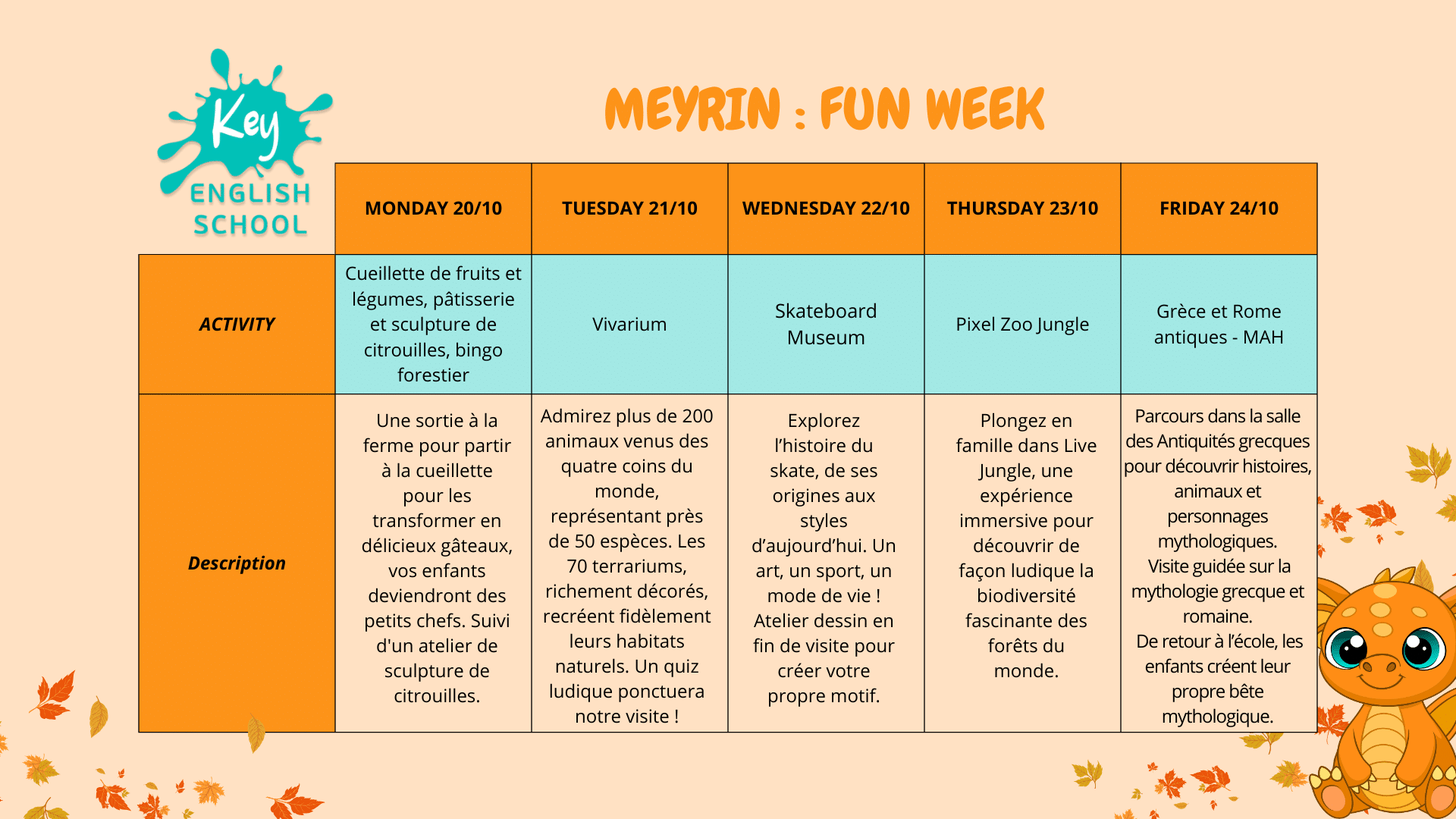 Les Fun Weeks à Meyrin offrent une semaine palpitante pour les enfants de 7 à 11 ans ! Du lundi au vendredi, de 9h à 17h, vos enfants exploreront la langue anglaise le matin, puis participeront à des activités stimulantes et amusantes l’après-midi. Nos enseignants anglophones assurent un apprentissage actif et interactif dans un environnement positif et inclusif.