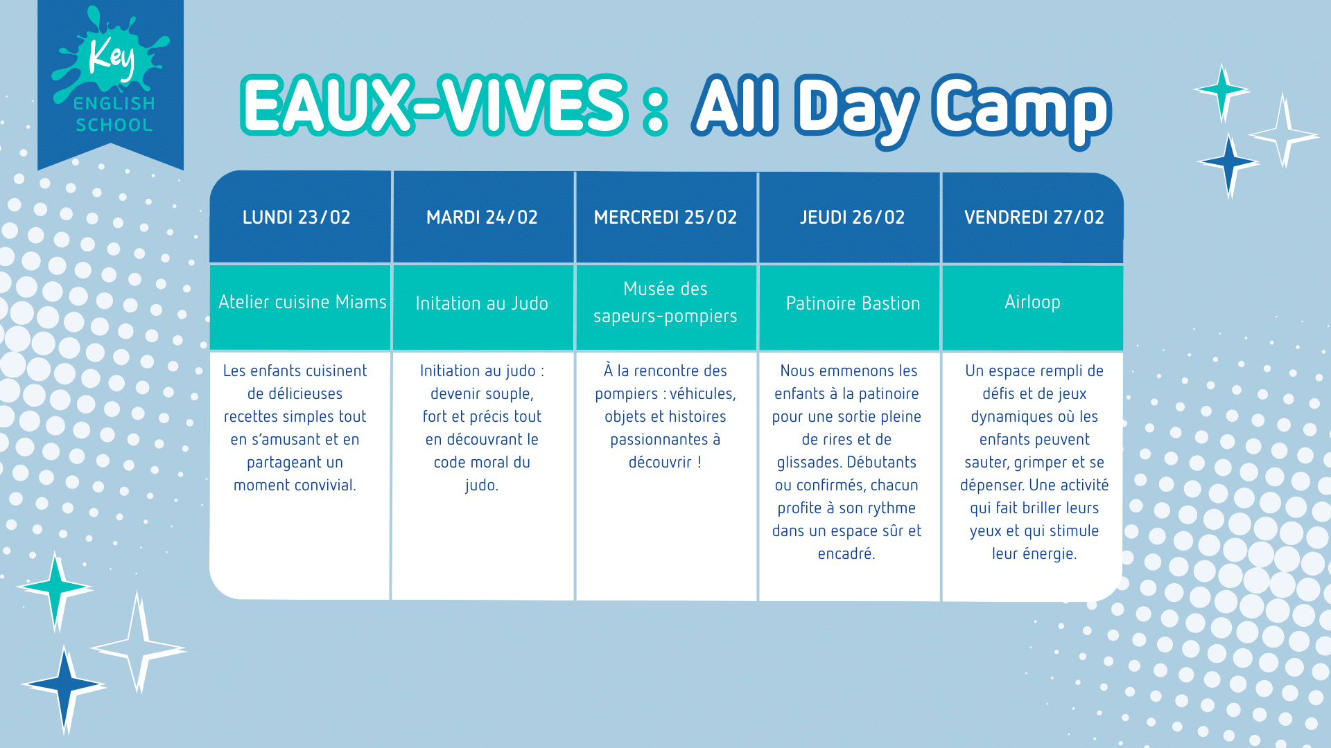 Bienvenue aux All Day Camps des Eaux-Vives, conçus pour les enfants de 7 à 12 ans passionnés d’apprentissage et de divertissement ! Du lundi au vendredi, de 9h à 17h, vos enfants profiteront d’une immersion totale dans l’anglais le matin, suivi d’activités excitantes et éducatives l’après-midi. Nos enseignants anglophones créent un environnement stimulant pour développer les compétences linguistiques tout en s’amusant. Offrez à votre enfant une semaine mémorable d’apprentissage et d’amusement aux Eaux-Vives.