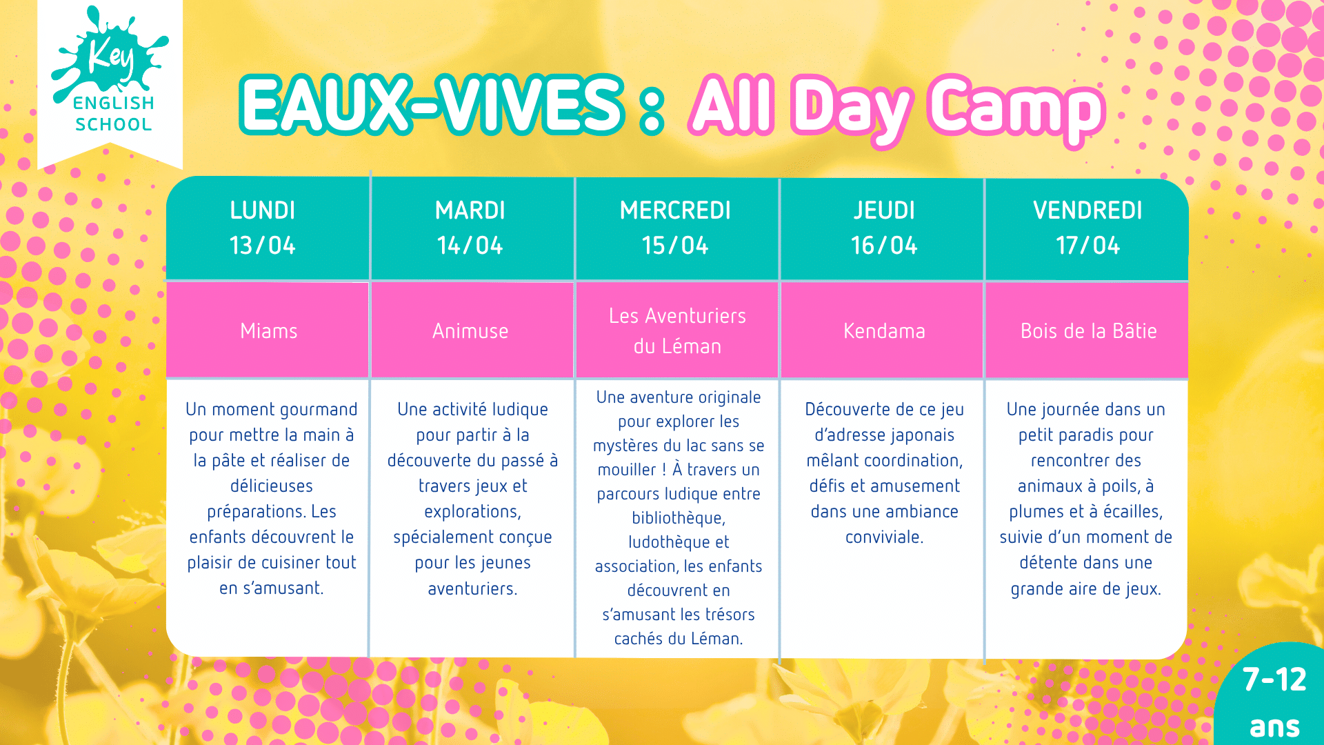 Bienvenue aux All Day Camps des Eaux-Vives, conçus pour les enfants de 7 à 12 ans passionnés d’apprentissage et de divertissement ! Du lundi au vendredi, de 9h à 17h, vos enfants profiteront d’une immersion totale dans l’anglais le matin, suivi d’activités excitantes et éducatives l’après-midi. Nos enseignants anglophones créent un environnement stimulant pour développer les compétences linguistiques tout en s’amusant. Offrez à votre enfant une semaine mémorable d’apprentissage et d’amusement aux Eaux-Vives.